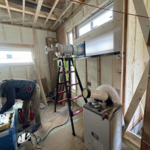 現在の工事工程:屋外に面する部分の気密処理をし気密測定を行いました。