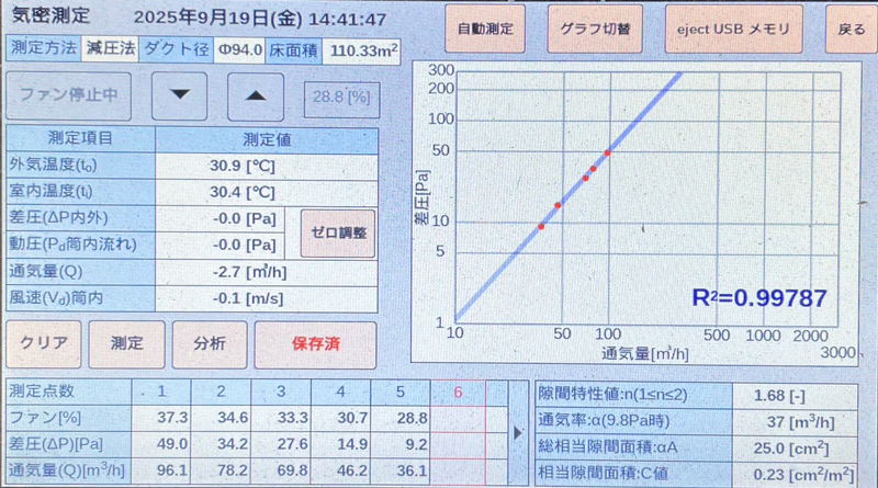 今回の住まいでは、相当隙間面積(C値)0.23cm²/m² という測定結果となりました。