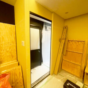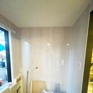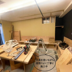 現在の工事工程:壁・ボード貼り、パネル張り施工をしています。