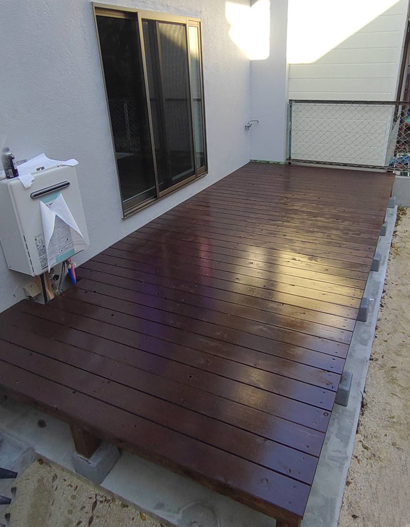 現在の工事工程:全面改修工事の完了後、ウッドデッキの新設施工を行いました。