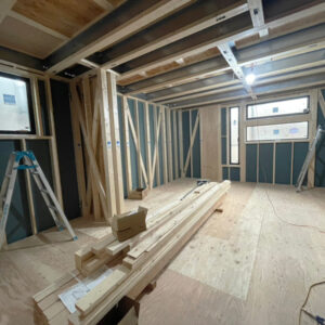 現在の工事工程:筋交い入れ・面材張り施工を行いました。