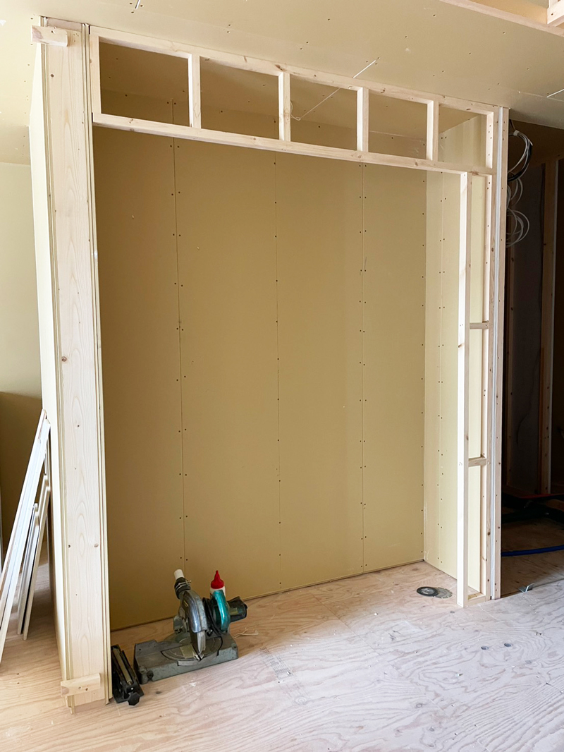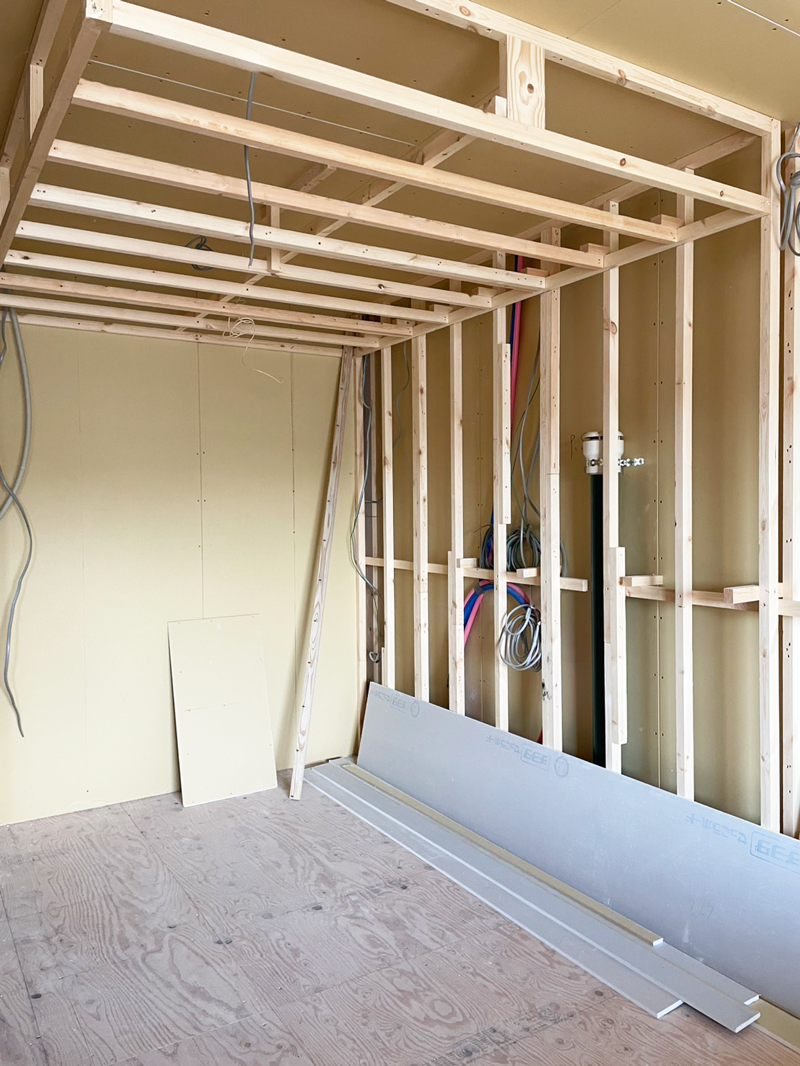 現在の工事工程:クローゼット枠の施工および内部下地の施工、キッチン部分の天井下地・壁下地の施工ならびに給排水配管・電気配線工事を行っております。