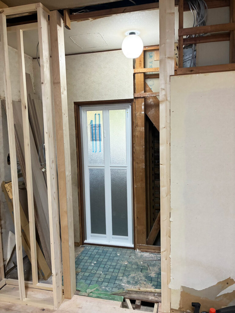 現在の工事工程:1階洗面所の解体工事後、新たに間仕切りの施工を進めております。