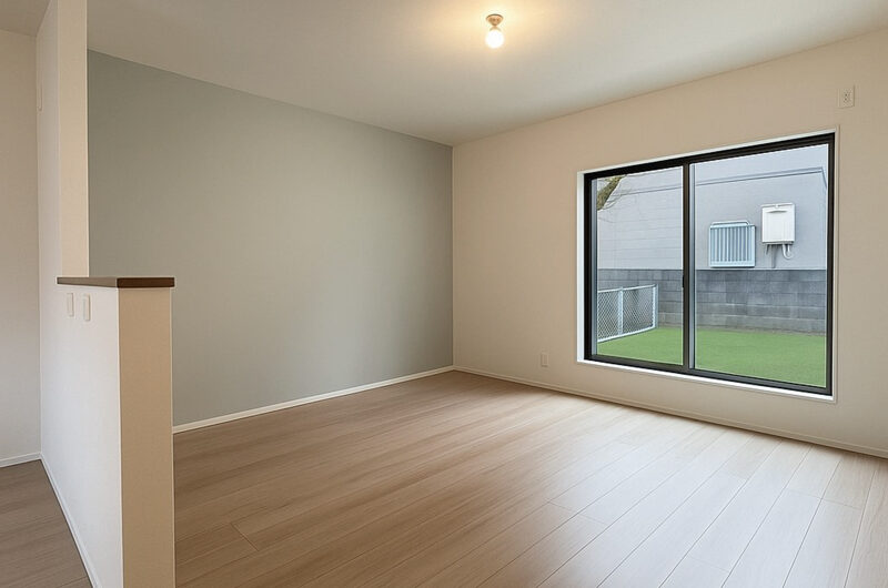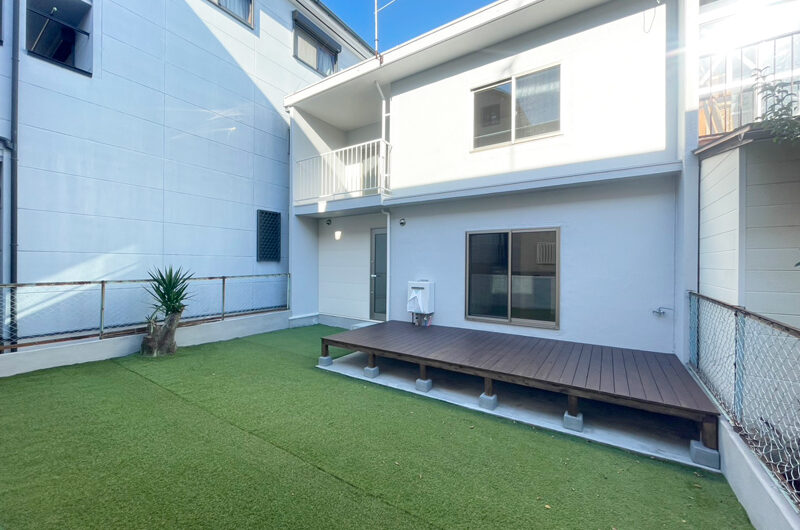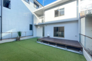 外装工事では、建物前面をサイディング張りに、裏面の外壁は塗装を実施し、美観と耐久性を確保。加えて、バルコニーの防水施工、裏庭への芝生敷設も行い、細部まで丁寧な仕上がりとしています。