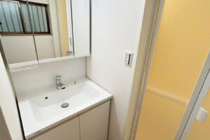 水まわり設備も一新し、洗面室には洗面化粧台と洗濯機パンを設置。